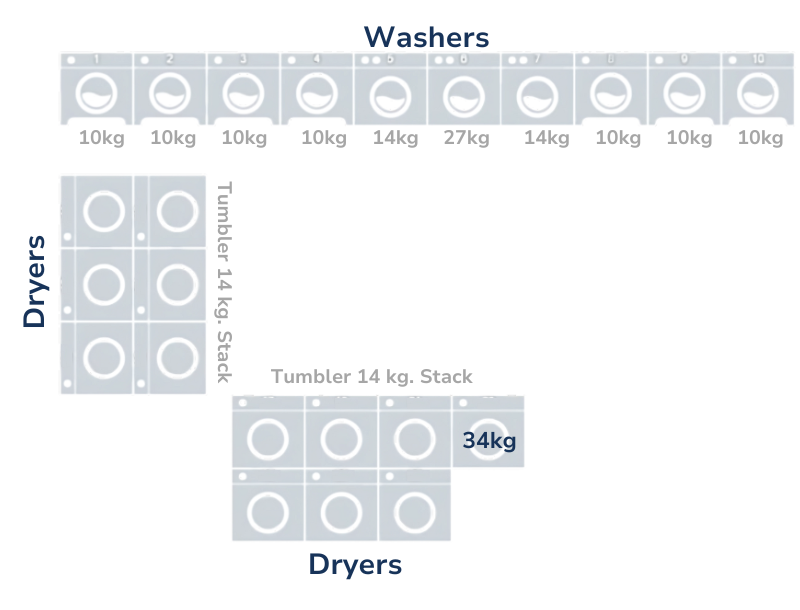 This layout showcases a well-organized configuration of washers and dryers in a laundromat. The washers are positioned along the top wall, offering various capacities ranging from 10 kg to 27 kg to cater to different laundry needs. In the central section, there are stackable 14 kg tumble dryers for efficient space utilization. A dedicated area features high-capacity 34 kg dryers, ideal for larger loads. The carefully arranged setup ensures smooth workflow and easy access for customers.